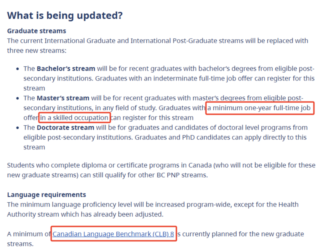语言要求:除了卫生医疗保健项目外,整个BCPNP计划的最低语言要求都将提高。目前计划新毕业生至少达到加拿大语言基准(CLB)8分。