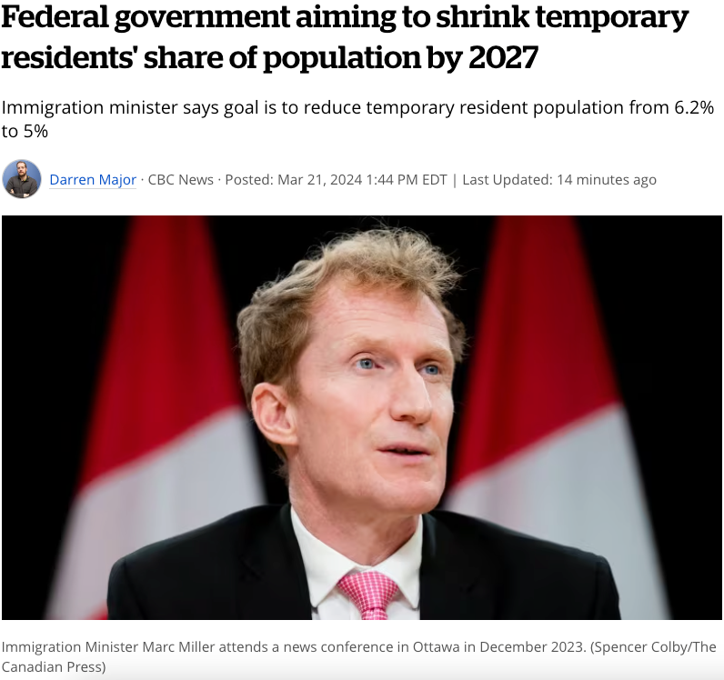 2023年,临时居民占加拿大人口的6.2%,政府正在努力限制临时居民人数。政府正努力在 2027 年前将这一比例减少到 5%。减幅1.2%,按照人口4000万计算,大约减少超过40万名临时居民。