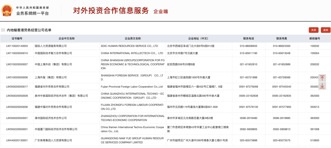 根据中国商务部官网公布的资料显示,目前内地共有14间官方认可的劳务公司可输出劳工到香港,分别位于北京、上海、福建、广东。