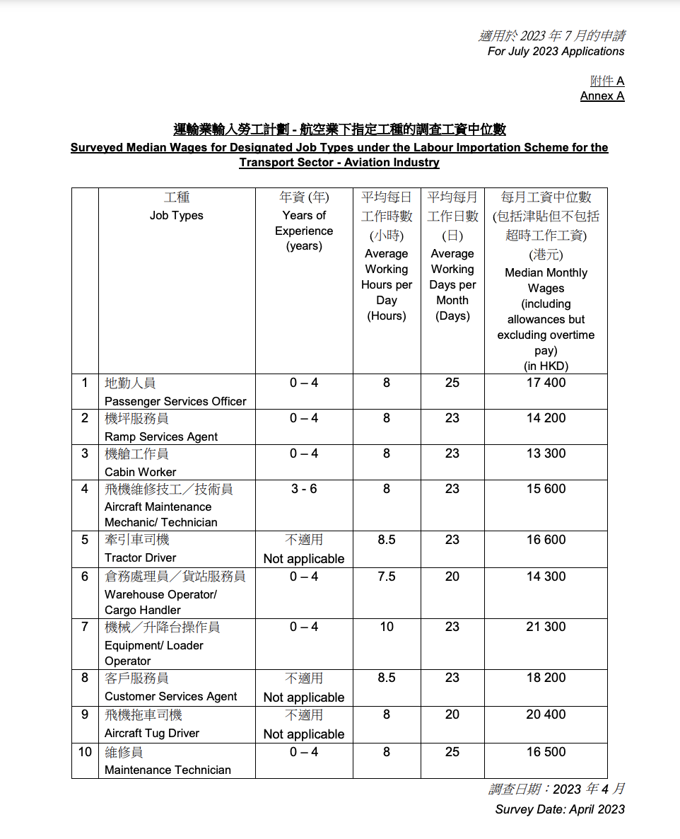 从运输及物流局网页的申请须知的附件中可以看到,上述10个航空业工种的月薪中位数最高为机械/升降台操作员的21,300元港币,其次是飞机拖车司机,每月工资中位数为20,400元港币,最低为机舱工作员的每月13,300元港币。