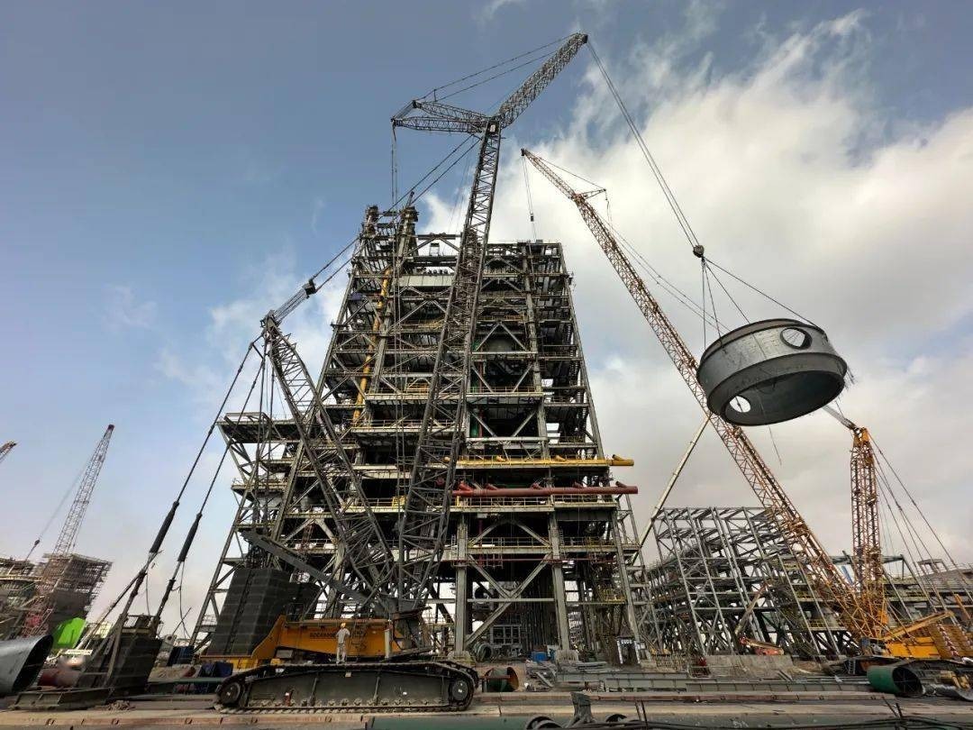 出国之家2023年7月31日报道 7月23日上午,寰球吉林化建阿尔及利亚贝蒂瓦托沙利钢铁厂项目100单元还原炉的第五部分炉壳上部(净重75.31吨)伴随司索的指挥指令缓缓升起,9时整,设备顺利就位。至此,该项目还原炉设备五大主体全部吊装就位,完成100单元的里程碑节点任务目标,为该单元下一步施工作业面的打开奠定坚实基础。