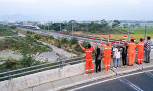 10月17日,在印度尼西亚万隆一座天桥上,雅万高铁建设单位之一中铁电气化局的中国和印尼籍员工挥舞着中国和印尼两国国旗,向远处驶来的一列雅万高铁高速动车组列车欢呼(无人机照片)。 新华社记者 徐钦 摄