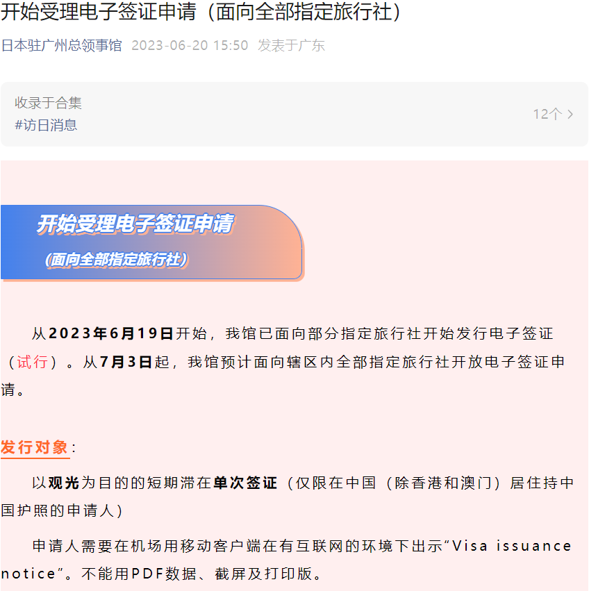据日本驻广州总领事馆官方微信公众号消息称,从2023年6月19日开始,日本驻广州总领事馆已面向部分指定旅行社开始发行电子签证(试行)。从7月3日起,预计面向辖区内全部指定旅行社开放电子签证申请。