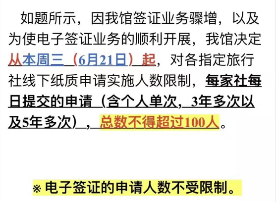 6月19日,上海领馆又给各大送签社新发了通知:为了电子签业务的顺利开展,6月21日起限制各指定旅行社的线下纸质申请人数,每家送签社每天提交的申请总数不得超过100人(含个人单次、三年多次和五年多次)。