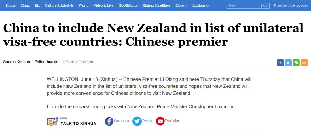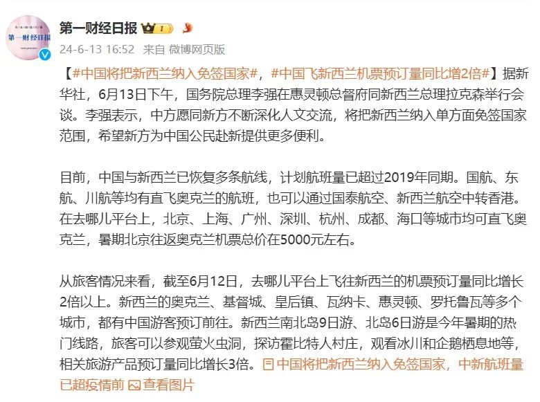 出国之家2024年6月16日报道 6月13日下午,国务院总理李强在惠灵顿总督府同新西兰总理拉克森举行会谈。李强表示,中方愿同新方不断深化人文交流,将把新西兰纳入单方面免签国家范围,希望新方为中国公民赴新提供更多便利。这一举措将进一步促进中新双方人员、经贸往来,利好我国入境游市场发展,同时也有望拉高中国游客赴新西兰旅游的热情。