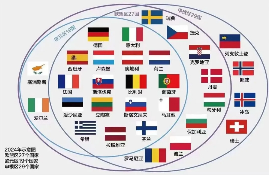 包括欧盟内 25 个成员国,法国、德国、奥地利、意大利、荷兰、比利时、卢森堡、丹麦、瑞典、芬兰、西班牙、葡萄牙、希腊、立陶宛、拉脱维亚、爱沙尼亚、波兰、匈牙利、捷克、斯洛伐克、斯洛文尼亚、马耳他、克罗地亚、罗马尼亚和保加利亚;