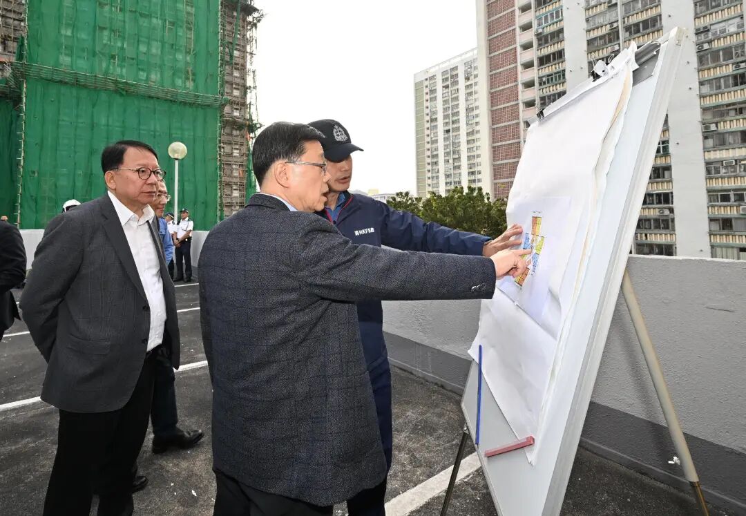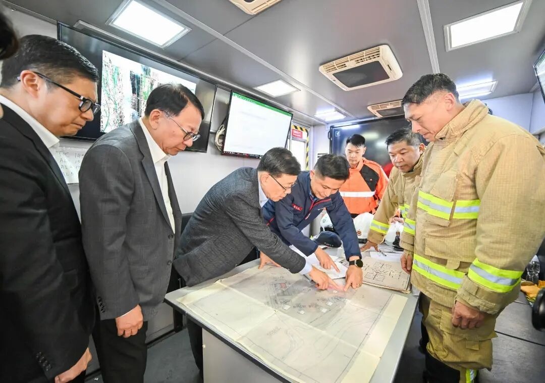 行政长官李家超11月27日下午到大埔宏福苑视察火警现场。图为李家超(左三)、政务司司长陈国基(左二)和保安局局长邓炳强(左一)在流动指挥车听取消防处处长杨恩健(右四)汇报火灾处理工作。