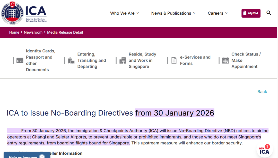 同时,根据官方消息:自2026年1月30日起,新加坡将在樟宜机场和实里达机场实施“禁载令”,旨在从源头阻止高风险旅客登上飞往新加坡的航班。