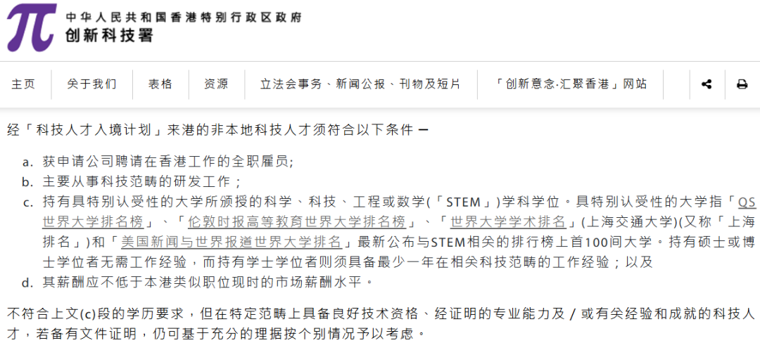 ③ 要求有科学、科技、工程或数学(STEM)学科学位,且毕业院校是「QS世界大学排名榜」、「伦敦时报高等教育世界大学排名榜」、「世界大学学术排名」(上海交通大学)(又称「上海排名」)和「美国新闻与世界报道世界大学排名」最新公布与STEM相关的排行榜上首100间大学。且硕士或博士学位无需工作经验,本科要至少1年相关科技工作经历。