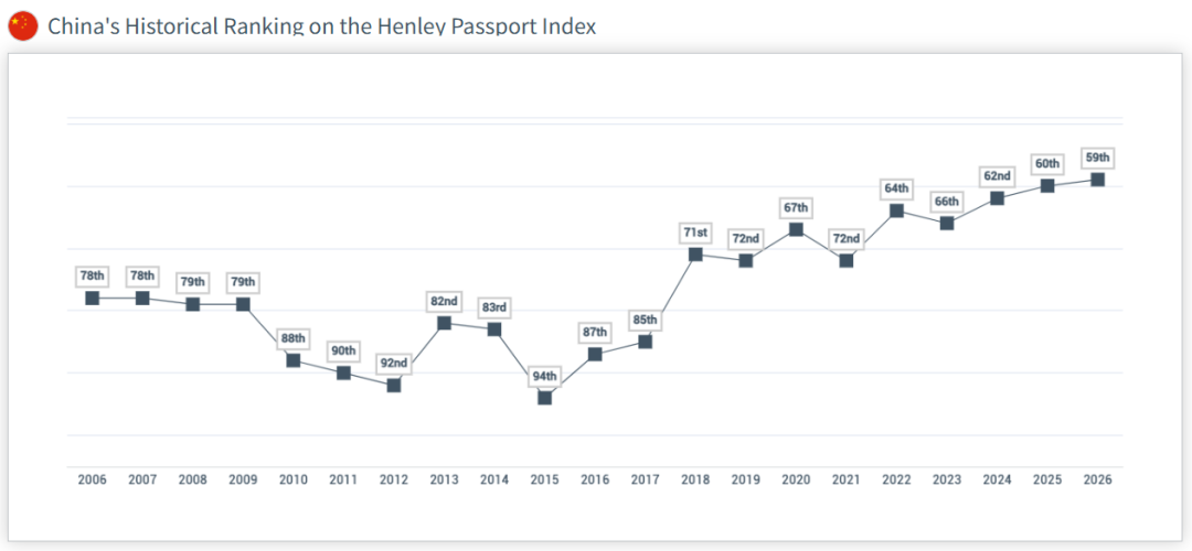 当然了,中国内地护照的含金量这10年也涨了不少!从2016年第87名升至2026年第59名,进步28位。