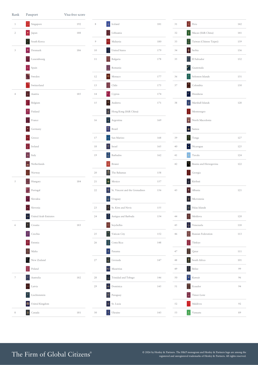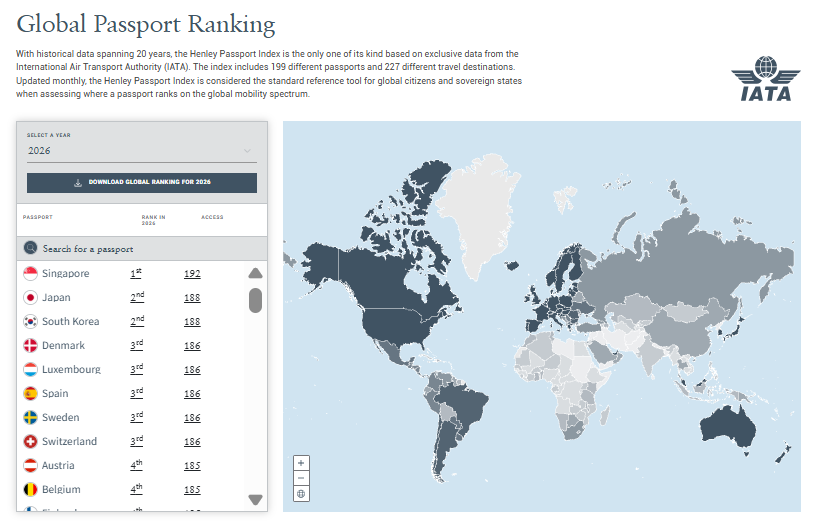 出国之家2026年1月16日报道 上周五,英国咨询公司Henley&Partners公布2026《亨利护照指数》(Henley Passport Index)。