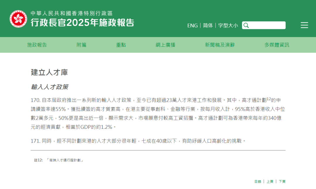 从续签表现来看,高才通首批续签申请率达 52%,续签获批比例却高达 94%,香港劳福局局长孙玉菡直言该续签率 “符合预期”,并强调 “人才是相互筛选的过程,我们拣人才,人才亦要拣香港”。而续签成功者的收入数据更印证了高才的优质性:约 95% 的人收入高于香港月薪 2 万港元的收入中位数,其中一半人收入接近翻倍(约 4 万港元 / 月)。据特区政府估算,高才通计划每年可为香港带来约 340 亿港元的经济贡献,占香港 GDP 的 1.2%。