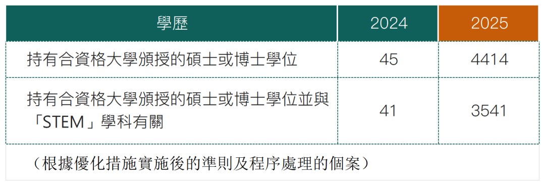 因 2024 年 11 月综合计分制门槛大幅提高,2025 年仅获批 7101 宗,较 2024 年降幅达 40%,获批者中 97% 为内地人才,62% 持有合资格大学硕博学位且八成与 STEM 学科相关,精准择优特征凸显。
