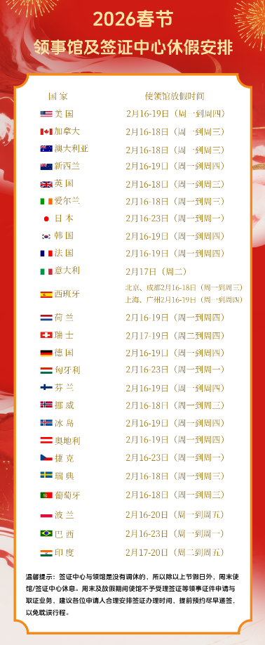 2026春节各国使馆签证中心放假汇总