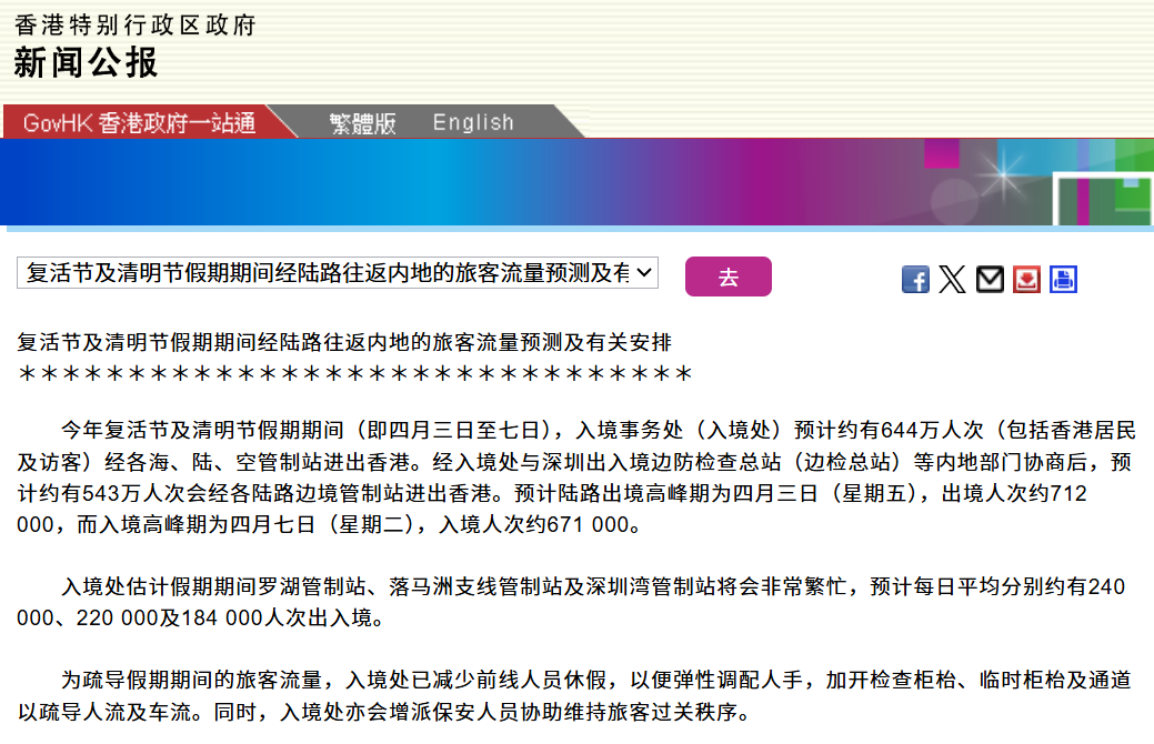 4月3日至7日复活节+清明节连假期间,香港入境处预测: