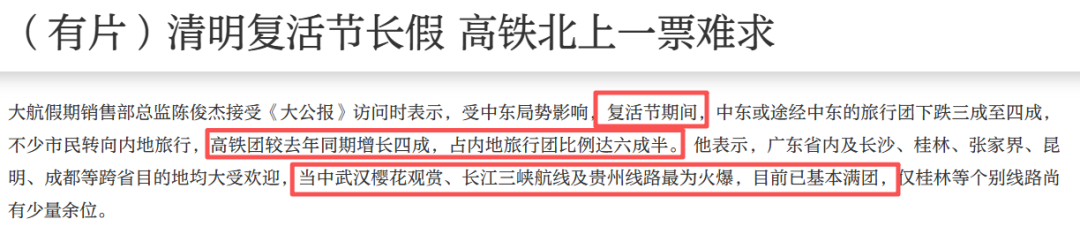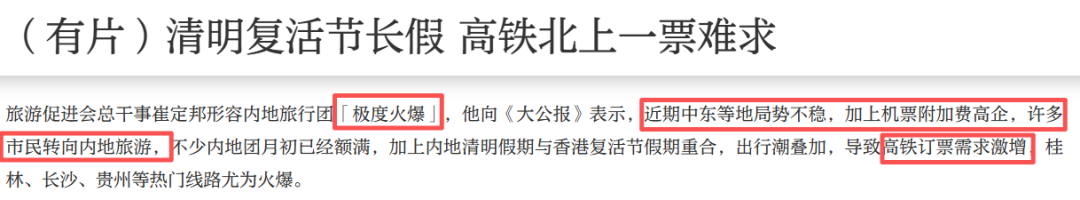 他说,很多人原本打算去中东或者欧洲度假,但因为那边局势紧张,燃油附加费又涨得厉害,最后都改搭高铁去内地玩了。