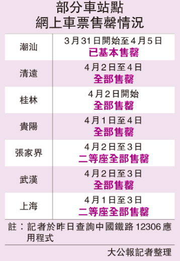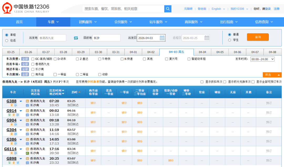 4月3日从香港西九龙出发去北京、上海、重庆、长沙、成都这些热门城市的高铁票,大部分早就卖光了,只能候补。
