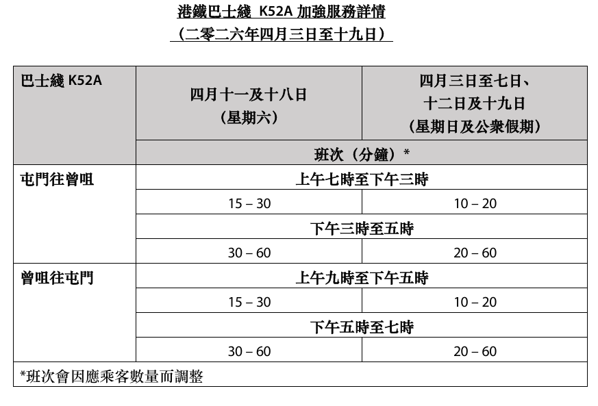 【扫墓专线】为方便大家清明扫墓,往返屯马线屯门站与曾咀灵灰安置所的港铁巴士 K52A 线服务,在3月4月的公众假期及部分周末,都会延长运营时间,同时加密发车频次。大部分时段的发车间隔缩短至10-30分钟一班。