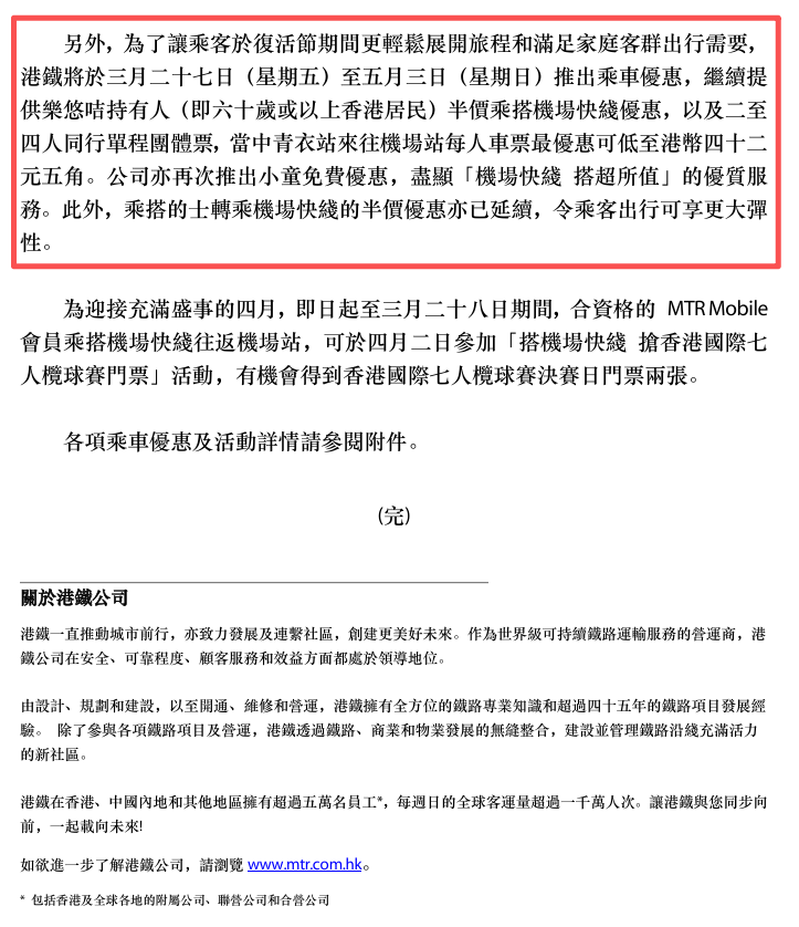 另外,为了让大家在复活节期间出门更方便,也照顾到带娃出行的家庭,港铁从3月27日(星期五)到5月3日(星期日)推出乘车优惠。