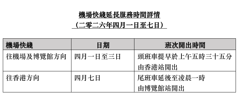 【机场快线】为满足大家假期出游的需求,4月1日(今天)至3日(周五),香港站发出的头班车,提前至早上5:35发车;4月7日(下周二),博览馆站发出的尾班车,延后至凌晨1点发车。