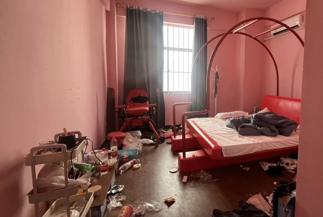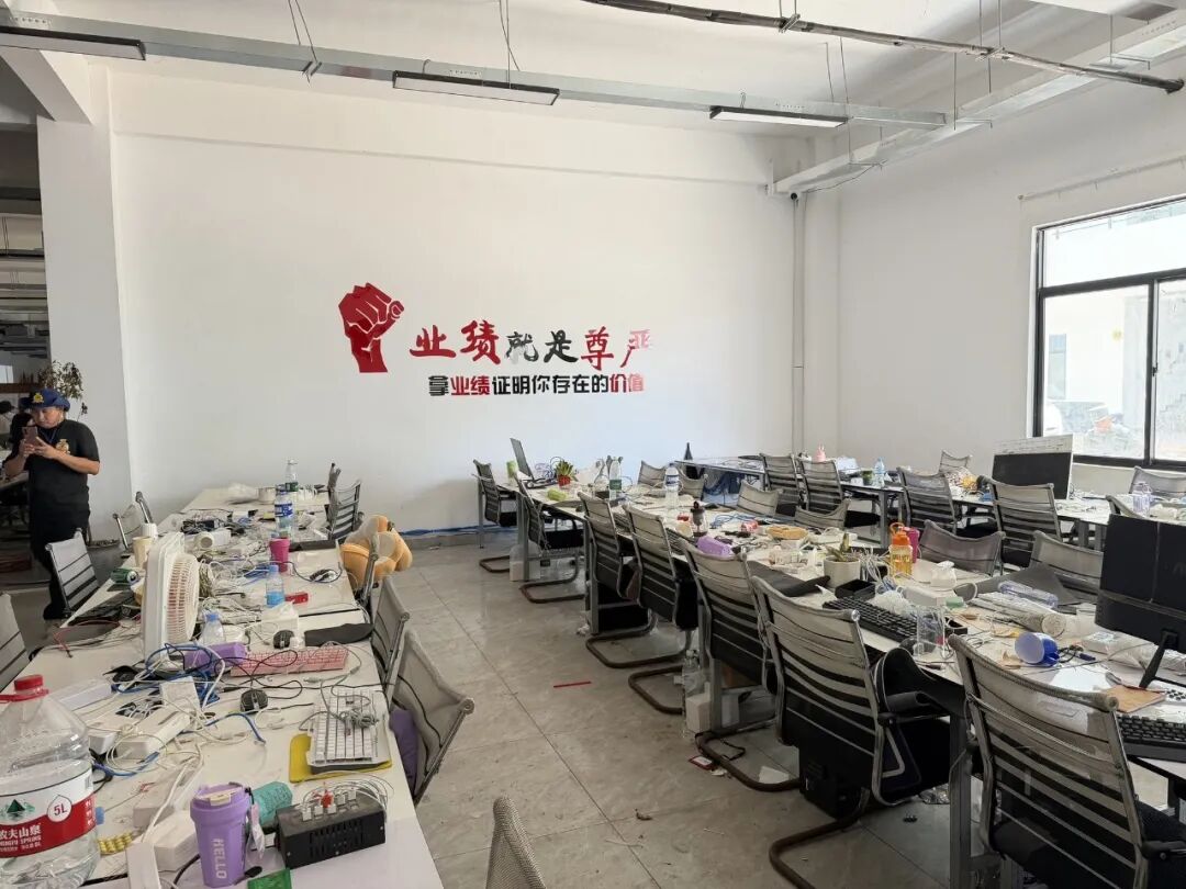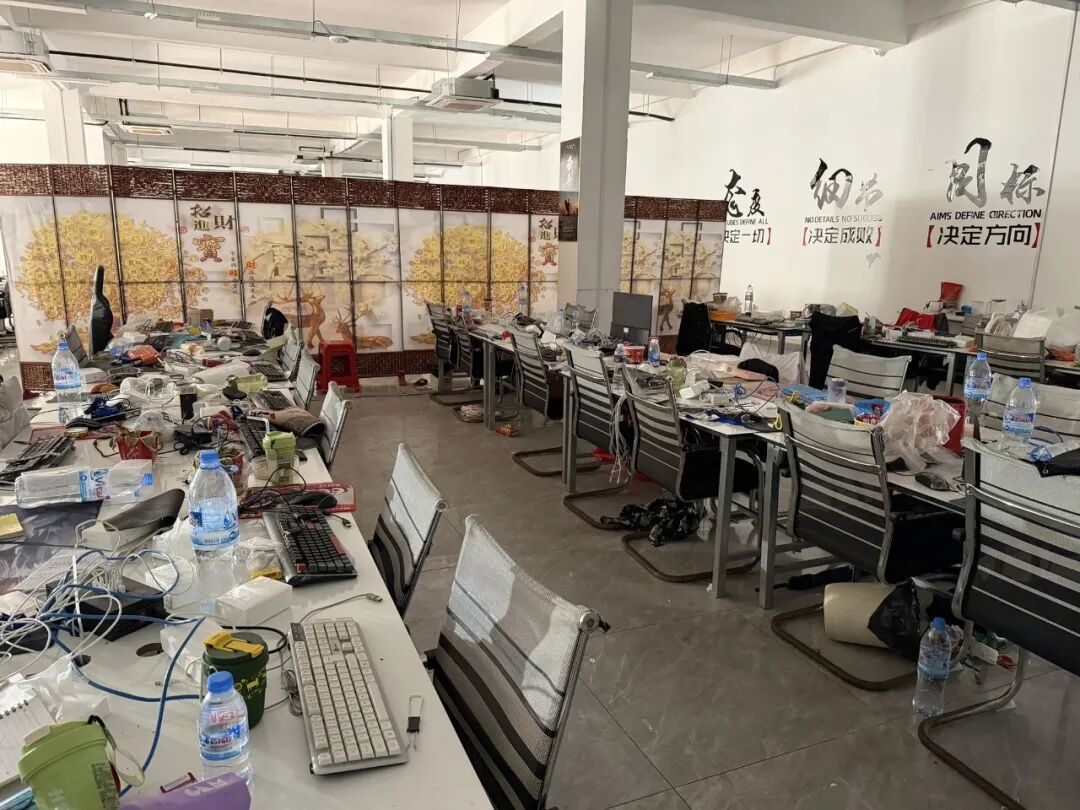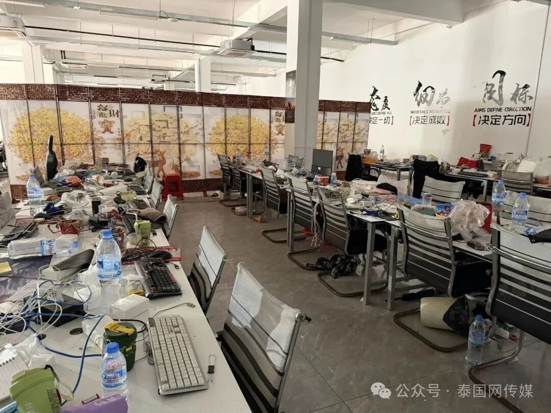 在一栋四层办公楼内,媒体看到桌面上仍遗留着零食、中文诈骗话术脚本、详细分工记录,以及散落在现场的美国电话卡。